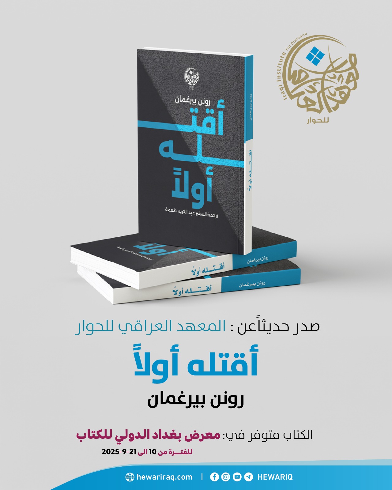 يعلن المعهد العراقي للحوار عن توفر ترجمة كتاب "أقتله أولاً" للمؤلف (الإسرائيلي) رونن بيرغمان، الذي ترجمه السفير عبد الكريم طعمة، وذلك في جناح المعهد ضمن فعاليات معرض بغداد الدولي للكتاب.
